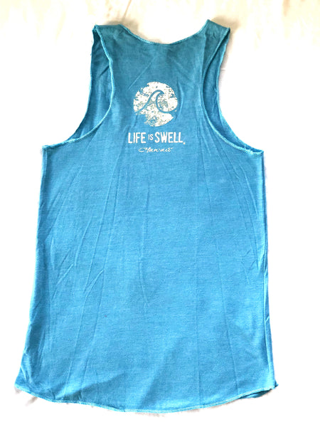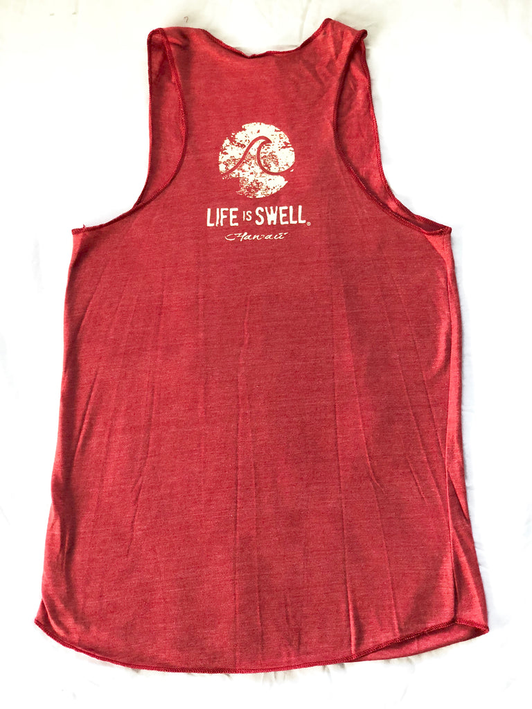 Printed in subtle off-white on a variety of rich, juicy colors. The reverse has our Life is Swell logo wave and "Hawaii" printed on the back between the shoulder blades.
